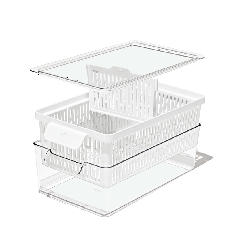 Sized to store leafy greens like spinach, and other fruits and vegetables like grapes and peppers.