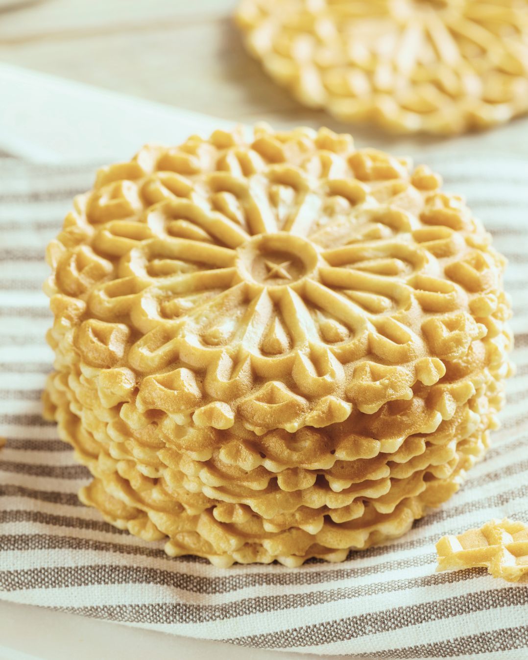 - Spread a pizzelle of dulce de leche and put another pizzelle on top to make a stuffed biscuit