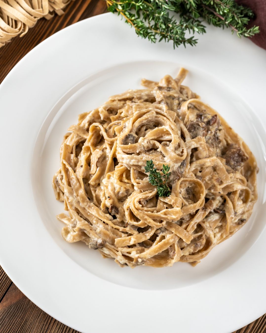 - Add the cooked pasta to the sauce and garnish with parmesan.