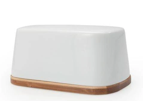 Beurrier moderne avec couvercle en porcelaine blanche et plat en bambou.