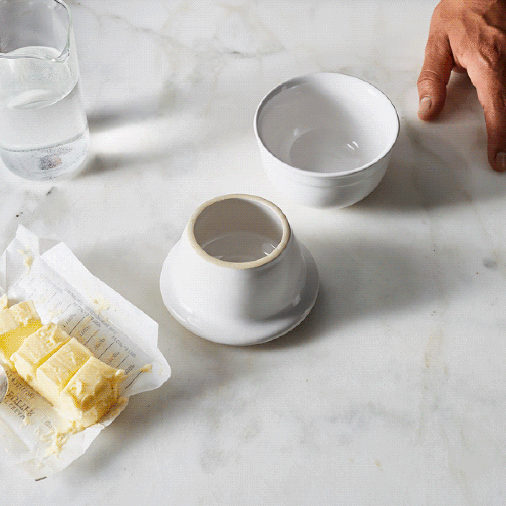 Mettre un fond d’eau fraîche dans le bol. Lorsque le couvercle est posé sur le bol, l’eau assure que le beurre ne soit pas en contact avec l’air.