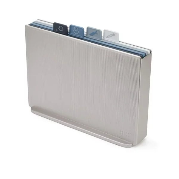 Jeu de 4 planches à découper antidérapantes adaptées à l’alimentation et étui de rangement fin.