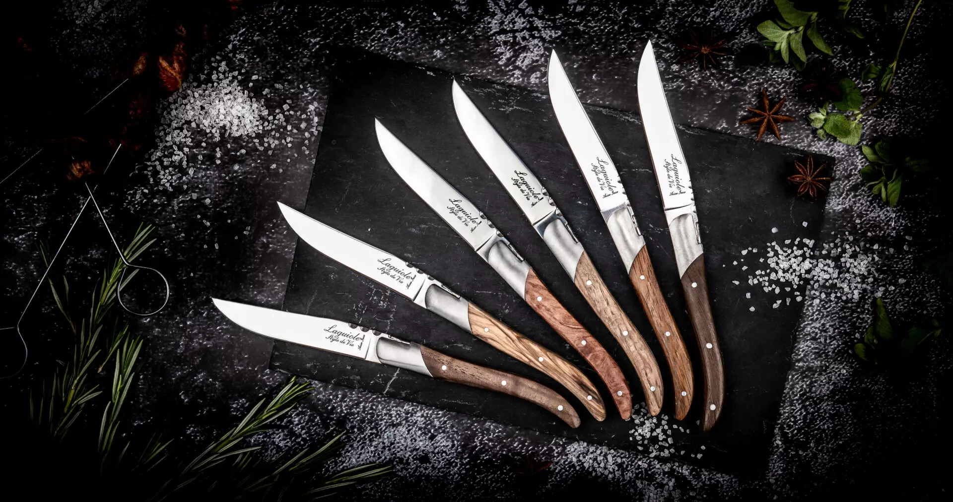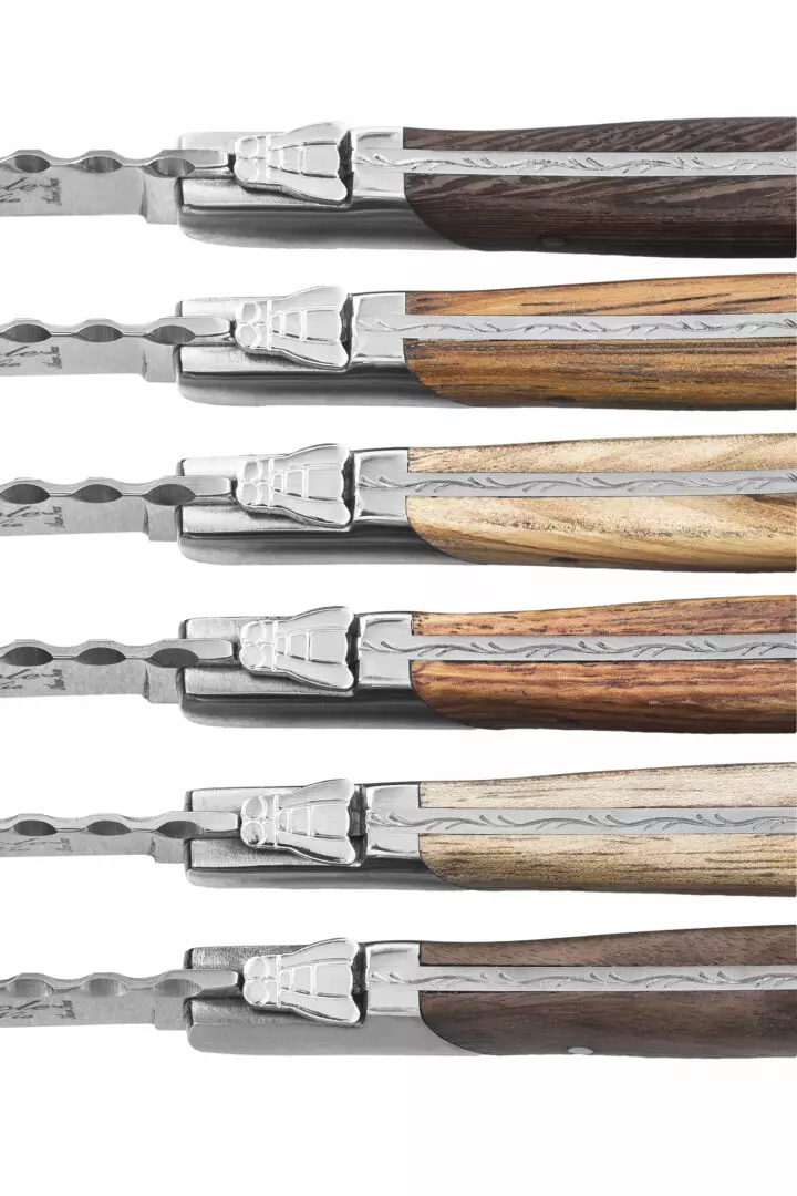 Ensemble de 6 couteaux à steak haut de gamme bois d’olivier, chêne, acacia, teck, wengé et pakka rouge.