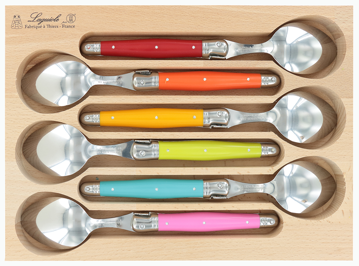En provenance de la région de Laguiole, connue pour ses couteaux artisanaux, ce set de six cuillères de table est en acier inoxydable avec des manches de couleur irisée mixte, emballé dans un bloc de bois.