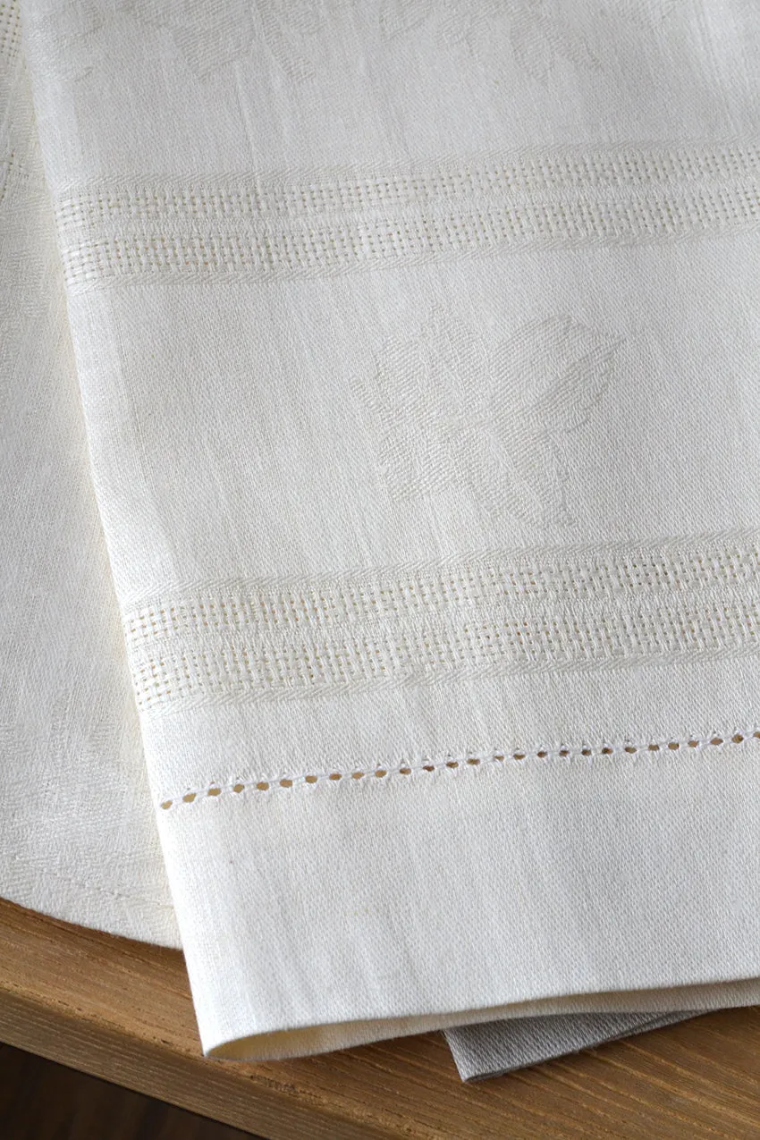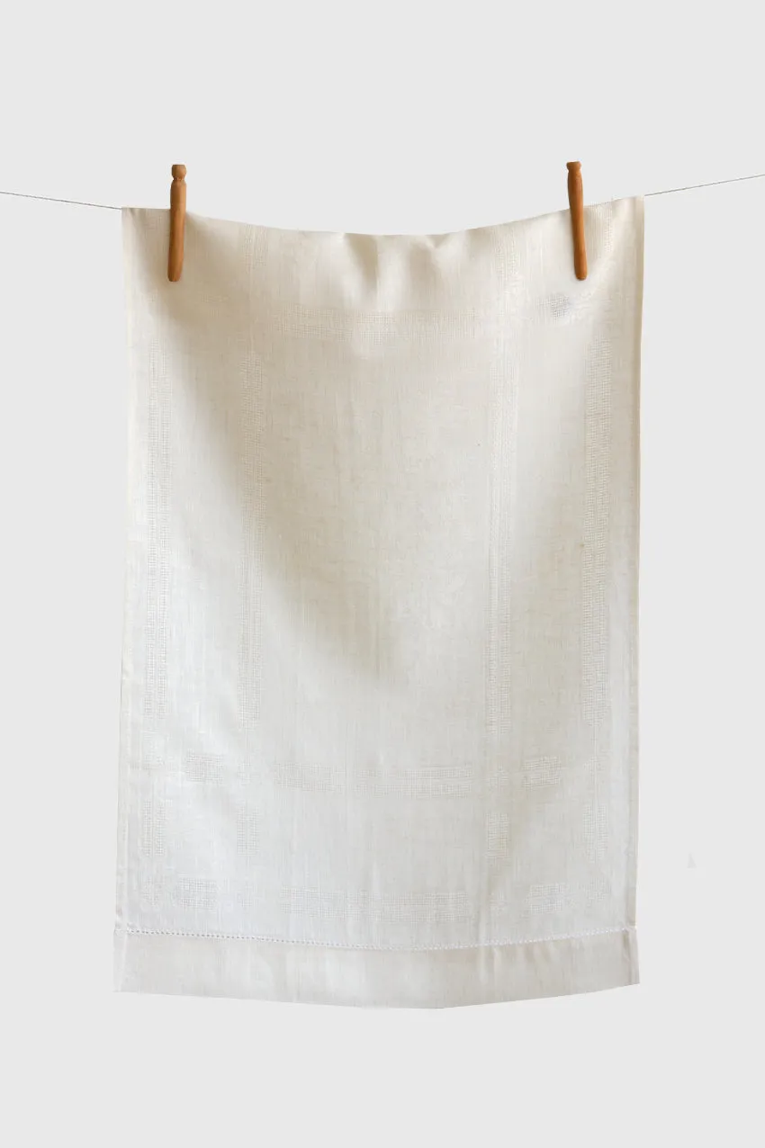 Tissé en jacquard avec un motif classique ton sur ton à carreaux et motifs floraux. 100 % lin avec une délicate bordure ajourée à une extrémité.