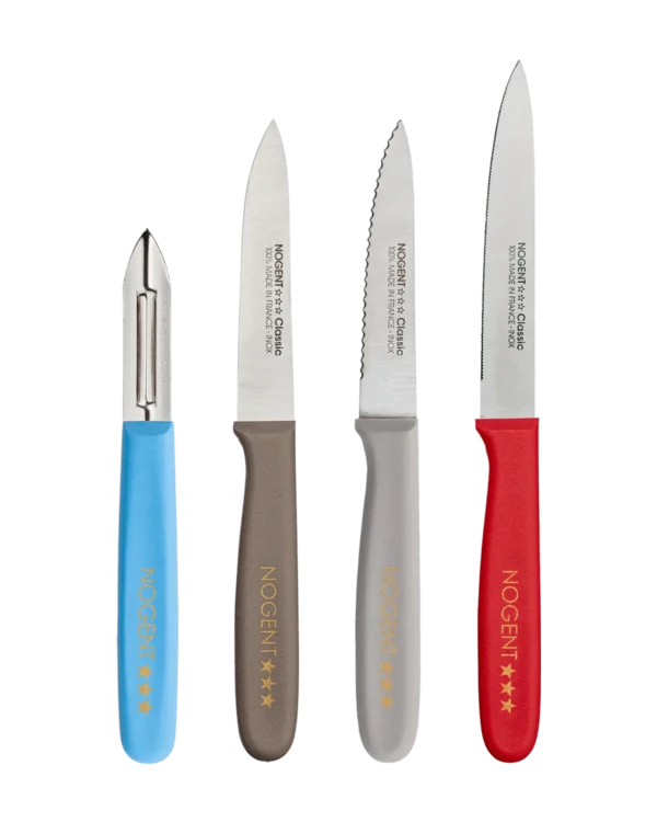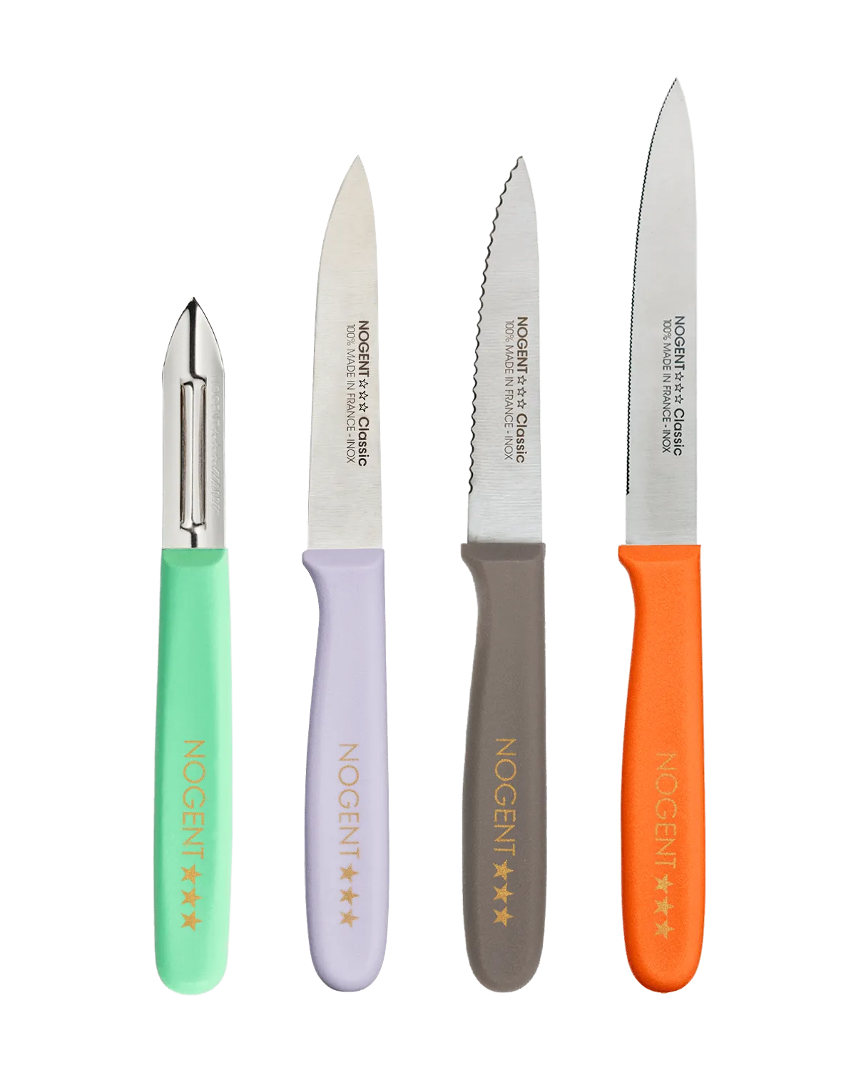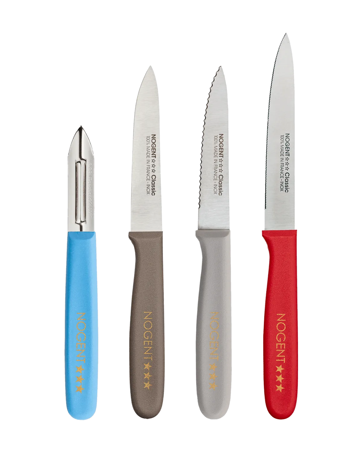 Comprenant les petits couteaux essentiels à tout arsenal de cuisine, cet ensemble comprend notre éplucheur à double tranchant, notre couteau d’office, notre couteau d’office dentelé de 3 mm et notre couteau utilitaire/couteau à tomates.