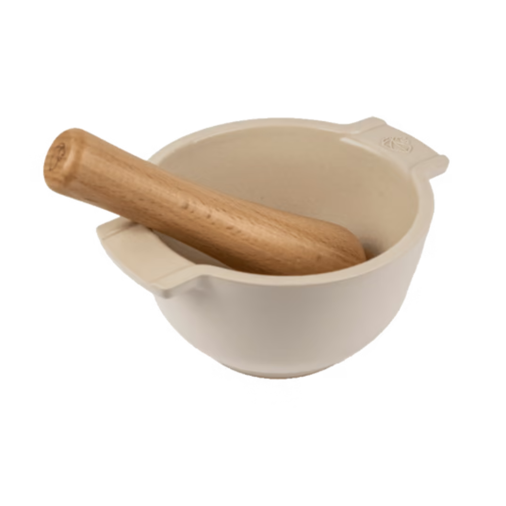Mortier en céramique. Stable et préhension facile grâce aux anses.