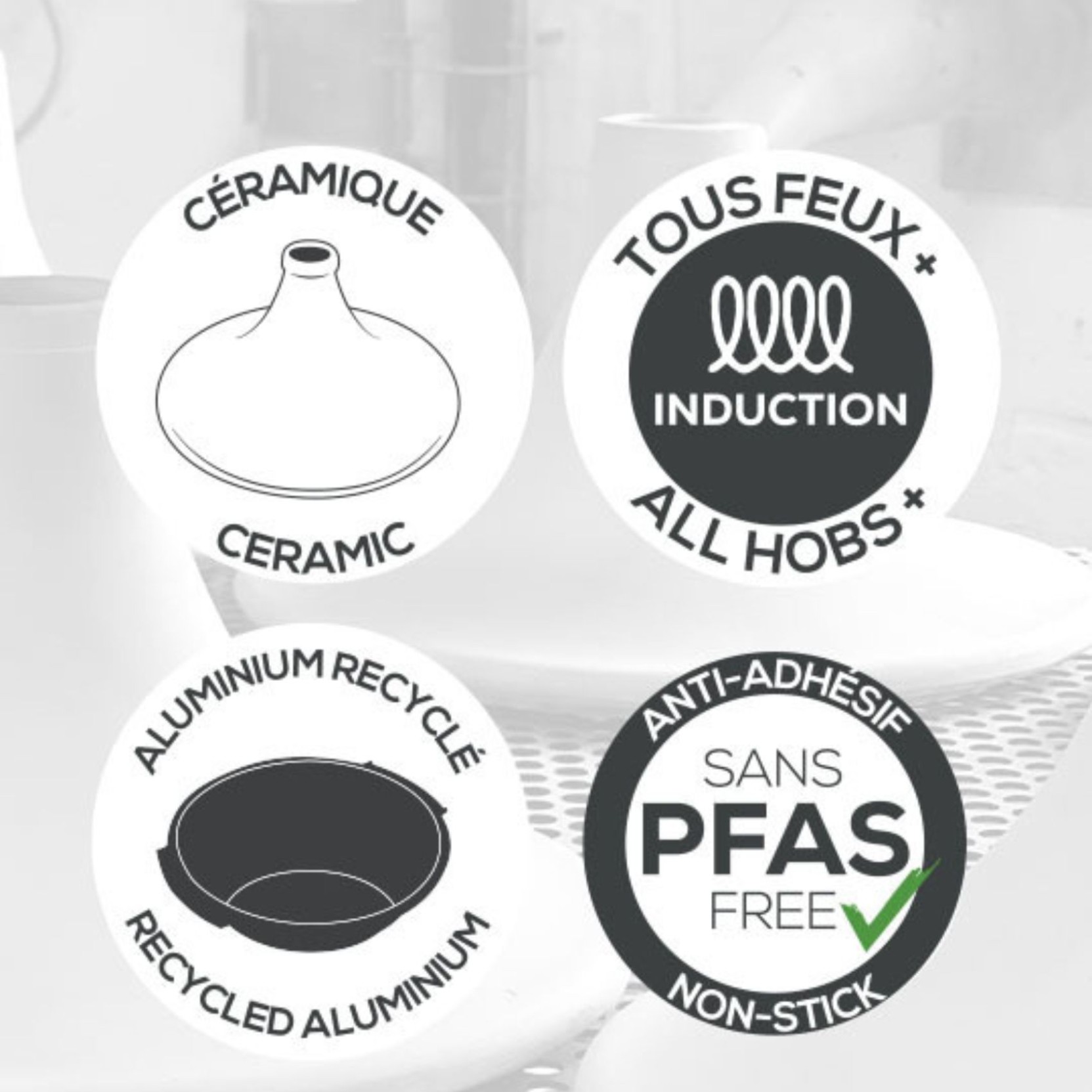 La base de ce plat a été conçue avec de l’aluminium 100% recyclé pour un impact environnemental réduit et une légèreté inégalée. Cette matière permet une diffusion homogène de la chaleur pour saisir et mijoter vos plats à la perfection. Équipé d’un revêtement en céramique antiadhésif fabriqué sans PFAs, il garantit une cuisine saine et sans matière grasse et assure un entretien facile.