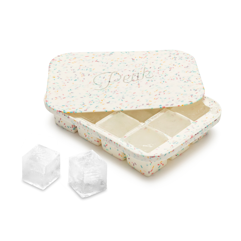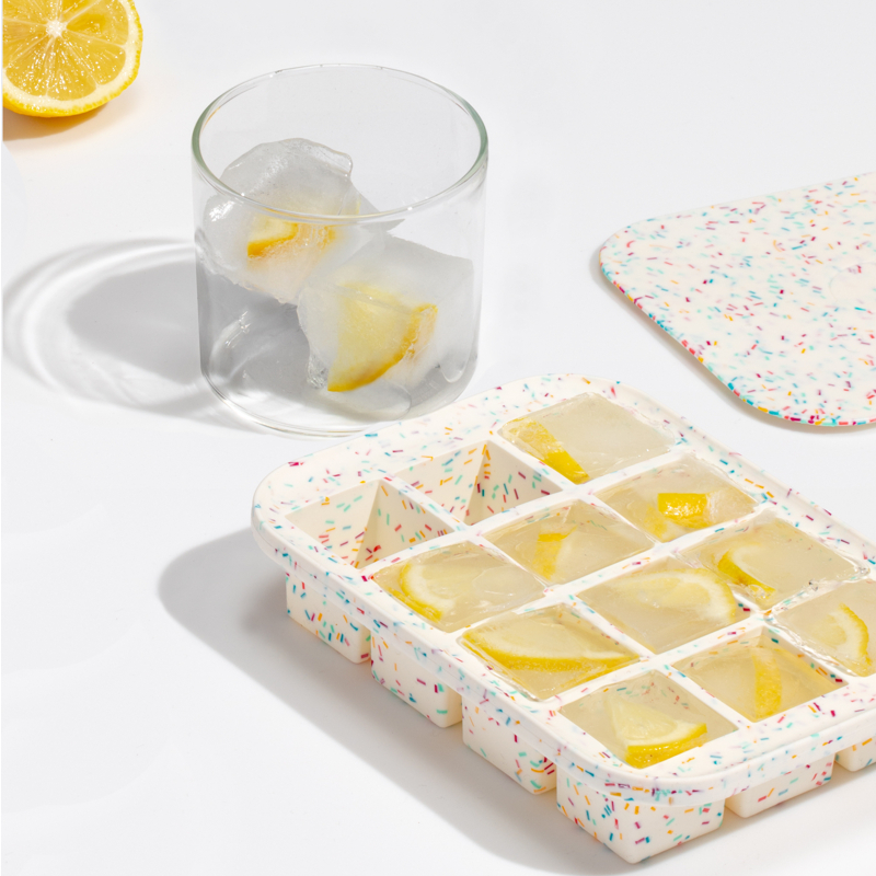 Bac à glaçons avec couvercle, 19 x 14 x 4cm H (7.5 x 5.5 x 1.75″ H), moucheté, en silicone.